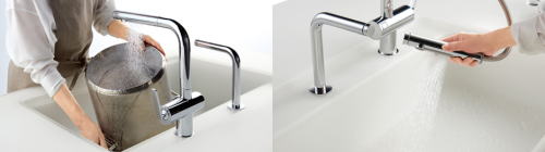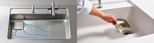 見た目はすっきりシンプルに。「水ほうき水栓」や「すべり台シンク」を備えて、
