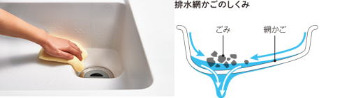 ・ごみをためにくい浅型の網かごを採用。